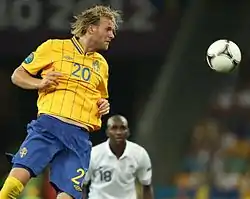 On 21 August 2007, he scored a hat trick (including two penalties) for Sweden U21 against Wales U21 in a 4–3 friendly defeat.[50] He was a member of the U-21 national team at the 2009 European Championship in Sweden and scored three times in the competition against Italy U21,[51] Serbia U21,[52] and a superb freekick against England U21 which contributed to a comeback from 3–0 down to 3–3 with Toivonen scoring the second goal.[53]
