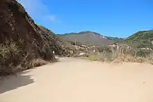 The remaining 10.2 miles (16.4 km) portion[39] of the original Old Coast Road connects on the north end to Highway 1 immediately north of the Bixby Creek Bridge. Most of the land on either side of the county road is privately owned. Trespassing, hunting, camping, or fires are not permitted at any time.[40] From Bixby Creek Bridge, the route descends about 400 feet (120 m) into Bixby Canyon. After crossing Bixby Creek, it parallels Serra Creek on the left until it reaches a ridge line at 1,200 feet (370 m) in the rugged Santa Lucia Range. The road crosses the El Sur Ranch for 6.5 miles (10.5 km), which along with Highway 1, creates two easements across the ranch. The ranch strictly enforces the no trespassing signs. Individuals who trespass on the ranch's land have been cited.[41][42]