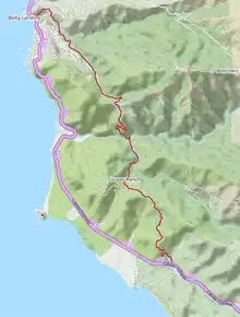 Segments of the trail, now known as the Coast Ridge Road (Forest Service route 20S05), have been given new names. The road from the Ventana Inn to Cone Peak is known as North Coast Ridge Road.[51][43][52] From the vicinity of Cone Peak to Nacimiento-Fergusson Road, it is named Cone Peak Road. To the south of the Nacimento-Fergusson Road, the route is named the South Coast Road. It terminates 64 miles (103 km) to the south at Salmon Creek.