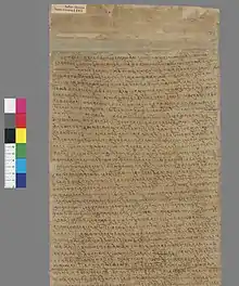 The Old Tibetan Chronicle is a composite text of various lists, narratives and bardic songs arranged to form a single account of the reigns of the Tibetan emperors. As the list of the Tibetan emperors found in the narrative ends with U Dumten ('U'i dum brtan), later known as Langdarma, the Chronicle must have been compiled during or soon after the reign of this emperor, that is, in the 840s.[4] Geza Uray has argued that this composition was made in Dunhuang itself rather than Central Tibet.[5]