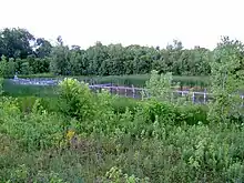 In the late 1940s, John D. Kraus set up OSU's first Radio telescope in the west campus farm fields next to Ackerman Run.[3] This was the first iteration of what would later be called the Big Ear. However, when more space was needed for an expansion, the project moved adjacent to Perkins Observatory in Delaware in 1961. Though the site has long since been abandoned, the ruins of the original control building and the antenna footings remain.