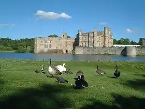 During the Second World War, Leeds Castle was used as a hospital.[1][28] After the war, hospitality for prominent guests resumed, but on a smaller scale than in the 1930s. David Margesson and Geoffrey Lloyd continued to visit frequently. Members of the royal family continued to be invited, including Queen Elizabeth The Queen Mother and Princess Marina. Another frequent visitor was Lady Baillie's cousin, John Hay Whitney, the U.S. Ambassador to Great Britain.[29] From the 1950s Lady Baillie's health started to deteriorate.[30] She had always been a cigarette smoker[31] and by the 1970s had become dependent on oxygen and needed the support of a resident nurse.[32] She had given 3,400 acres (14 km2) of the castle's estate to her son Gawaine in 1966, but wanted the castle itself to be available after her death to the public for the arts and for conferences.[7] Not wanting it to be taken over by the National Trust, she made arrangements for it to be administered by a charitable trust, which is now the Leeds Castle Foundation.[1][33]