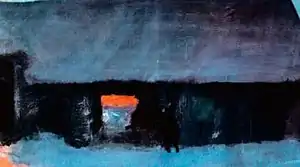 Vinterdagen dør (The dying of a Wintersday), 1943. Depicting the setting sun through the entryway of Bognemark, Høst's farm in Gudhjem, Bornholm - one of his most frequent motifs.