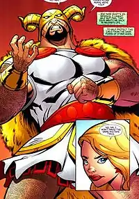 Olympian is a founding member of the Global Guardians.[2] As detailed in a flashback, Olympian protests when the original 'Ice', otherwise known as Icemaiden leaves the Global Guardians because of her feelings of inadequacy. When he learned that his fellow members of the Global Guardians were to be supported by the Bialyan dictator Queen Bee, Olympian joins up. An unwitting participant in a public relations ploy, the Olympian helps his teammates and Justice League Europe battle a giant, alien robot on the grounds of the League's embassy. This robot was sent by the Queen Bee herself, using technology stolen from a now-dead member of the alien Dominators. The Queen did not care if the robot ended up killing any of the Guardians. The Olympian and Godiva help save nearby confused well-wishers from being crushed when the robot, damaged, threatens to fall on them. After the Queen Bee dies, her successor diagnoses his condition as schizophrenia and arrests him. He later reunites with the other Global Guardians and remains a member since.