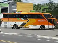 An Efisiensi bus (branded with SatelQu logo), which is considered as an inspiration for telolet horn sound.[1]