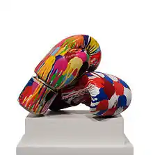 In a series of paintings, Hassan performs a painting technique inspired by his boxing career. This involves dipping his boxing gloves into paint and punching onto a large canvas.[8] He uses some classical references in his work, such as Nike taking off the sandal,[9] but also takes some influence from Islamic art.[10] Additionally, he creates sculptures and patterns from the spray painting materials he uses. His series of paintings called Injections, are single dots of colour with streams of paint issuing from the nucleus. They refer to his daily shots of insulin from being diabetic.[9]