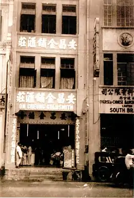On Cheong Jewellery was founded in 1936 by Ho Yew Ping, an emigrant of Guangdong Shunde province of China.[2][3] The name of the company is derived from the phrase "平安昌盛", meaning peace and prosperity.[4][5] On Cheong moved to its current location, a shophouse on South Bridge Road, in 1941.[2][3][4] In the 1940s On Cheong acquired Kwong Yik and Nan Jing Goldsmiths as part of an expansion and was formally incorporated in 1949.[3] Ho Yew Ping’s wife and the eldest son took over the operations of the business after Ping's death in 1965.[2]
