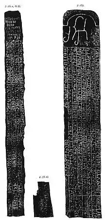 The Ongin inscription was discovered in 1891 in Mongolia near the Ongi River, 160 km south of the Orkhon inscriptions and 402 km south-west of the Tonyukuk inscriptions.[1]:177 It was erected in honor of El Etmish Yabgu. Line 12 makes it clear that the author of the inscription erected a memorial to his father.[1]:183 According to Gerard Clauson, it must have been erected between 716 and 735, during the reign of Bilge Qaghan.[1]:191 According to Ercilasun it was erected in 719 or 720.[2]