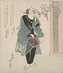 Onoe Kikugorō III (三代目 尾上 菊五郎, Sandaime Onoe Kikugorō) (1784-16 May 1849) was a Japanese kabuki actor, the first and among the most famous kaneru yakusha, a type of actor who performs a wide variety of roles. This is in contrast to the vast majority of kabuki actors, who specialize in only playing women, heroes, villains, or other particular types of roles. Kikugorō was close friends with the playwright Tsuruya Nanboku IV, who wrote the role of Oiwa, in the play Tōkaidō Yotsuya Kaidan, specifically for him.