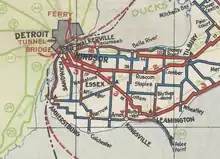 The original alignment of Highway 18 followed a completely different routing for the first 18 months of its existence than it would for the following 50 years. As it was first designated in 1930, Highway 18 provided a shortcut between Windsor and Tilbury. In anticipation of the opening of the Ambassador Bridge, as well as the nearby Detroit–Windsor tunnel, Windsor and the surrounding townships sought road improvements between Windsor and Maidstone to alleviate traffic along Talbot Road and bypass or separate several level crossings of the Michigan Central Railway (MCR) beginning in early 1929.[13][14][15] The province chose to designate a new right-of-way adjacent to and north of the MCR in July of that year,[16] and spent the next several months constructing the cut-off (now known as Provincial Road) from Howard Avenue to north of Maidstone.[17] By 1930, Highway 2 had been rerouted to begin at the ferry docks in downtown Windsor, following Ouellette Avenue to Tecumseh Road, then east to and south along Howard Avenue; the short segment near Maidstone became Highway 2A.[18]