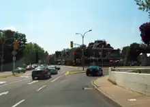 Until the 1950s, Highway 29 connected to King Street in downtown Brockville via Perth Avenue. On October 9, 1952, Stewart Boulevard was opened, connecting with William Street.[29] A few years later in October 1954, a contract to construct the Brockville Bypass section of Highway 401 was awarded.[30] Construction of the cloverleaf interchange at Highway 29 began in 1957.[31] Both the interchange and the eastbound lanes of Highway 401 (from west of Brockville to Prescott) were opened by Minister of Highways, Frederick Cass, on November 13, 1959.[32] The westbound lanes opened 10 months later on September 16, 1960.[33]
