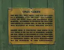 In 1984 the mill was restored by the Natal Bouvereniging. A year earlier, the mill was added to the monument list. An article in the newspaper Die Burger of 4 May 1996 criticised the restoration as historically incorrect. A certain James Walton states that the restorers were after a copy of Mostert's Mill than on a restoration of the original. In 1999, a plan to get the mill working again was rejected. Locally, the mill is also known as Die Ou Meul. The Afrikaans word for mill is meul. Nevertheless, the building is called Onze Molen in official documents, after the original Dutch spelling.