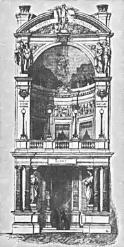 In 1851, the Opéra-National was revived, and on 1 May Edmond Seveste was appointed director.[16] By the end of July he had taken a lease on the Théâtre Historique (72 Boulevard du Temple).[17] Built by the dramatist Alexandre Dumas, the theatre had opened on 20 February 1847, closed on 20 December 1850, and remained unused. The entrance to the theatre was a long, narrow vestibule, squeezed between two other buildings, with a facade only eight meters wide. The auditorium, located in the back, was unusually wide (20 meters) and only 16 meters deep.[18] It had an audience capacity of 1500–1700[2] and was thought to have excellent acoustics for opera.[17]