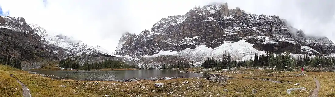 Opabin Lake can be accessed by two climbing trails, the East Opabin trail and the West Opabin trail, which form a 6 km circuit beginning and ending at Lake O'Hara.[2][3] Both trails ascend approximately 250 metres (820 ft). East Opabin consists of switchbacks through the woods above Lake O'Hara followed by an uphill hike alongside a stream fed by runoff from the snowy peaks. West Opabin involves a somewhat more rugged ascent, where the mossy woods yield to scree, stone steps, and open rocky paths cut into the slopes that offer vistas of Lake O'Hara, Mary Lake, and the surrounding mountains.[4][5] A third, alpine trail connects the East Opabin trail to nearby Lake Oesa.[6]