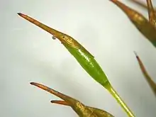 In bryophytes, the calyptra (plural calyptrae) is an enlarged archegonial venter that protects the capsule containing the embryonic sporophyte.[6] The calyptra is usually lost before the spores are released from the capsule. The shape of the calyptra can be used for identification purposes.[7]