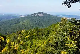 In clearing large parts of the stone field for roadbuilding (from 1838), metal objects and other artefacts were discovered that were later recognised as of Celtic origin. The increasing amount of basalt quarrying from 1858 destroyed parts of the hillfort, especially the easily accessible lower wall rings and brought a huge quantity of archaeological finds to the surface, of which mainly the metal objects have survived in various collections. On the initiative of Alfred Götze, the quarrying was stopped between 1902 and 1927. In 1929 the Steinsburg Museum was built on the saddle between the Großer and Kleiner Gleichberg and this is where the majority of finds are still on display today.[1] The Gleichberge are thought by several researchers to the same place mentioned in the Geography of Ptolemy as the settlement of Bicurgium.[2] In the specialist and local history literature, the names Kleiner Gleichberg and Steinsburg are both used to refer to the hillfort.