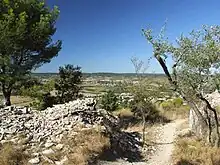 The Oppidum de Roque de Viou is on a hilltop overlooking the valley called the Vaunage, above the village of Nages-et-Solorgues, in Gard, between Nîmes et Sommières, in Occitanie, France. It is in the commune of Saint-Dionizy and is one of six Iron Age oppida in the Vaunage; about 200m from the Oppidum de Nages or Oppidum des Castels. It was occupied in three periods between 700 BCE and 600 BCE and between 350 BCE and 300 BCE and around 50 BCE. It has been listed since 1980 as a monument historique by the French Ministry of Culture.[1]
