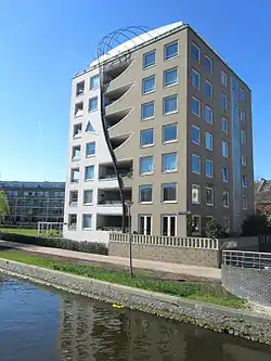 The Oranje-Nassau Kazerne is the largest of a series of military buildings along the Singelgracht canal. These buildings, on either side of the Muiderpoort city gate, were constructed in the course of the 19th century along the city walls protecting the eastern side of the city. The buildings were part of the Hollandse Waterlinie, a defensive line around Amsterdam to protect the city from foreign invaders. The Oranje-Nassau Kazerne was built in the years 1810-1813 between the 17th-century bastions Outewaal and Oosterbeer to house the city's infantry garrison and the troops manning the defenses around the city.[1][3][5] The windmill De Gooyer on the bastion Oosterbeer had to be moved because the barracks took away too much wind. In 1814, it was moved to nearby Funenkade.[6]