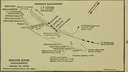 The Battle of Dogger Bank was a naval engagement during the First World War that took place on 24 January 1915 near the Dogger Bank in the North Sea between squadrons of the British Grand Fleet and the Kaiserliche Marine (High Seas Fleet).