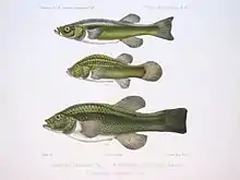 Orestias is a genus of pupfish. Older systematics classified them into the own family Orestiidae. They are found in lakes, rivers and springs in the Andean highlands of South America, and several species are considered threatened.[2] They are egg-laying fish that feed on small animals and plant matter.[3][4] The largest species can reach a total length of 27 cm (10.6 in), but most remain far smaller.[5][6] Their most characteristic feature is the absence of the ventral fin, although this is shared by a few other pupfish.[6] Despite their moderate to small size, they are important to local fisheries and a few species are farmed.[7]