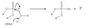 Although the exact mechanism of OPAA’s nerve-agent detoxification is unclear, researchers have deduced that the basic reaction follows a general base mechanism with a simple in-line displacement of fluoride at the phosphorus center using an activated water molecule, as seen in Figure 1.[8]