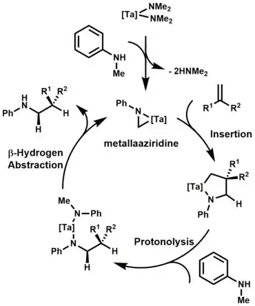 The catalytic cycle may proceed by β-hydrogen abstraction of the bisamide, which forms the metallaaziridine. Subsequent olefin insertion, protonolysis of the tantalum-carbon bond, and β-hydrogen abstraction affords the alkylamine product.[14][15][16]
