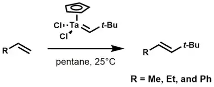 Ethylene, propylene, and styrene react with tantalum alkylidene complexes to yield olefin metathesis products.[3]