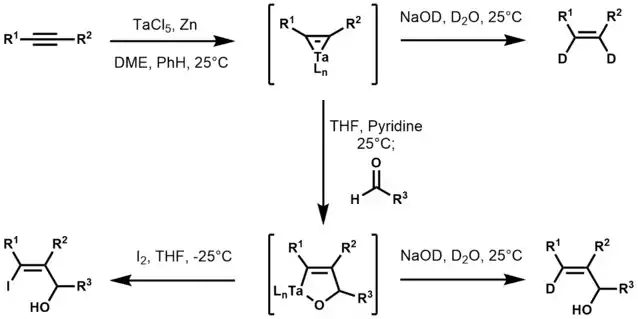 - ↑ Takai, Kazuhiko; Kataoka, Y.; Utimoto, K. (1990-03-01). "Tantalum-alkyne complexes as synthetic intermediates. Stereoselective preparation of trisubstituted allylic alcohols from acetylenes and aldehydes". The Journal of Organic Chemistry. 55 (6): 1707–1708. doi:10.1021/jo00293a008. ISSN 0022-3263.