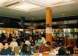 The shopping centre had both full-service restaurants such as a sushi bar, izakaya, okonomiyaki restaurant ('Abeno') and ramen bar ('Ramen Seto'), a cafe, as well as a food court offering bento, kushiyaki, donburi such as unatamadon noodles and other Japanese foods. A wagashi-ya also operated at Yaohan and Minamoto Kitchoan used Yaohan Plaza to establish its formal London presence in 1996.[9][13] A couple that had moved to London from the craft town of Mino, Gifu operated the shop 'Utsuwa no Yakata', which sold Japanese porcelain and tablewares.[14] The main hall hosted fairs where additional special import products such as antiques were sometimes sold. The space also hosted car sales and displays of Japanese culture such as kimono.[12][9]