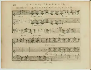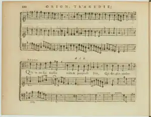 Orion is an opera by the French composer Louis Lacoste on a libretto by Joseph de Lafont and Simon-Joseph Pellegrin. It was first performed at the Paris Opera (at the time known as "Académie royale de Musique") on 19 February 1728[1] and was performed for the last time on 12 March 1728.[2] The reduced score was printed in quarto by Christophe Ballard.[3] Orion only received a modest success and was never staged nor performed again for another season. However, extracts have already been played by the ensemble Fuoco e Cenere in 2019.[4]