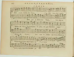 Some vocal pieces were applauded, such as the duet between Orion and Alphisa ("Vole, Amour, viens nous secourir", Act IV, Scene 2)[43] and the one between Orion and Diana ("Transports de haine & de rage", Act V, Scene 2), which was “the greatest beauty” of the scene.[44] The scene 5 of Act III in which Diana reveals to Alphisa that she's in love with Orion was hailed as "one of the most well written" scenes of the opera.[45]