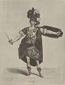Denis-François Tribou as Castor in the opera Castor & Pollux (1737) of Jean-Philippe Rameau, engraving of a drawing or of a lithography by "H.te L." (before 1904)