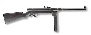 The Orița is a 9×19mm Parabellum submachine gun that was manufactured in Romania during World War II and for several years afterwards. It was named for Captain Marin Orița (Military Technical Corps, Romanian Army), who is credited in Romania with its design.[4] (Other sources describe the Orița as a joint Czech-Romanian project;[1] the Czech Leopold Jašek and the Romanian Nicolae Sterca are also considered to have contributed to its design.[2][5]) The mass production was made by CMC Uzinele Metallurgice Copșa Mică together with Cugir Arms Factory. The first version, Model 1941, entered operational service with the Romanian Army in 1943.[1] Two later improved models were the Model 1948, with a fixed wooden stock, and the rare paratrooper Model 1949, with a folding metal stock.[6] It remained in service with the Romanian Army until it was replaced in the 1960s by the more powerful Pistol Mitralieră model 1963/1965, a Romanian version of the AK-47 assault rifle. The Orița remained in service with the Romanian paramilitaries ("Gărzile Patriotice") until the 1970s.[2]