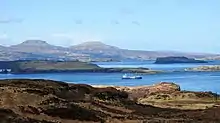 The eastern part of the island, which faces Skye, is low-lying grass land, while the western part rises until it reaches several cliffs, up to 72 metres (240 ft) in height.[5] Views from the westward side are to the Atlantic, Idrigill Point, Macleod's Maidens, with the much larger island of Wiay c.0.8 miles north-west, behind which the flat tops of Healabhal Bheag and Healabhal Mhòr (Macleod's Tables) dominate from the Duirinish Peninsula.
