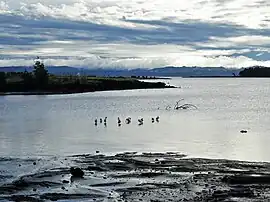 ![]() Royal spoonbills (kōtuku ngutupapa) at the mouth of the Oruarangi Creek | |