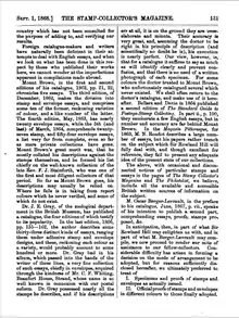 A page of the philatelic magazine, "Stamp Collector's Magazine" (London, 1868), describing the stamp catalogue issued by Berger-Levreault in June, 1867.