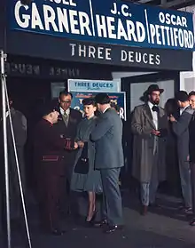 In 1942, he joined the Charlie Barnet band and in 1943 gained wider public attention after recording with Coleman Hawkins on his "The Man I Love".[1] Pettiford also recorded with Earl Hines and Ben Webster around this time.[1] After he moved to New York, he was one of the musicians (together with Dizzy Gillespie, Thelonious Monk, Kenny Clarke) who in the early 1940s jammed at Minton's Playhouse, where the music style developed that later was called bebop.[1] He and Dizzy Gillespie led a bop group in 1943.[1] In 1945, Pettiford went with Hawkins to California, where he appeared in The Crimson Canary, a mystery movie known for its jazz soundtrack, which also featured Josh White. He then worked with Duke Ellington from 1945 to 1948 and for Woody Herman in 1949, before working mainly as a leader in the 1950s.[1]