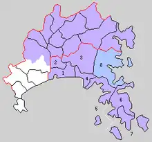 1. Ishinomaki; 2. Hebita; 3.Inai 4. Watanoha; 5. Oginohama; 6. Ohara; 7. Ayukawa; 8. Onagawa; Blue = no change in status; Purple = Ishinomaki City