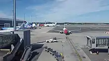 The east pier of the original terminal is for international flights. The gates for Schengen area flights are E-gates while the F-gates for the non-Schengen area are at the easternmost end of the terminal.[53] An expansion to the non-Schengen end of the east pier was opened during the summer of 2022.[54] Four gates near the end of the east pier are flexigates where doors can be opened or closed to switch between Schengen and non-Schengen flights.[55] EU controllers have been somewhat skeptical of the Schengen/non-Schengen flexigates, and there were a few incidents where the wrong doors were opened so that passengers who should have gone through the border control did not.[56]