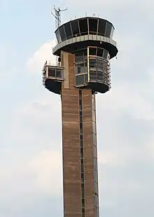 The airport has two parallel runways, aligned 01/19. The west runway 01L/19R is 3,600 by 45 metres (11,811 ft × 148 ft), while the east runway 01R/19L is 2,950 by 45 metres (9,678 ft × 148 ft).[4] Both have taxiways, allowing 80 air movements per hour.[33] The runways are equipped with CAT IIIA instrument landing system[70] and the airport is supervised by a 91-metre (299 ft) tall control tower.[60] Once departing aircraft are 15 kilometres (9 mi) away from the airport, responsibility is taken over by Oslo Air Traffic Control Center, which supervises the airspace with Haukåsen Radar. The airport has two ground radars, on the far sides of each of the runways. Both at the gates and along the taxiways, there is an automatic system of lights that guide the aircraft. On the tarmac, these are steered by the radar, while they are controlled by motion sensors at the gate.[71]