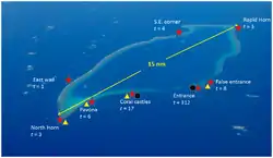 Osprey Reef from the air, showing nautilus detection sites used in a 1998–2008 study by Dunstan et al.[1]