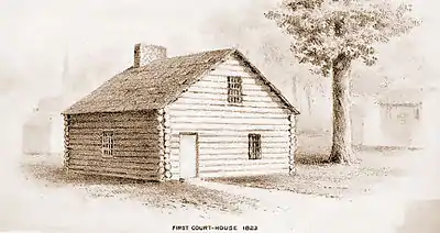 Drawing of the original Fulton County courthouse, situated in Lewistown, Illinois, on land donated for this purpose by Ossian Ross (source: History of Fulton County, Illinois).