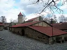 In the Zwinger there were battlements, which are only preserved on the south side.[14] The defense walls made of rubble are plastered in places. At the time of the construction of the fortress church, fighting was done with bows and crossbows, so vertical slit embrasures were added for the crossbowmen. Horizontal embrasures were used in later times for the use of small arms. However, the military use of the complex increasingly receded into the background.