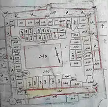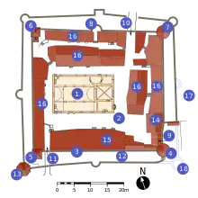 | 1. Church2. Churchyard3. Main wall4. Schulglockenturm 5. Waagglockenturm6. Achtlöchriger Turm7. Pulverturm8. Schalenturm9. Gate | 10. Modern gate11. Side loft12. Zwinger13. Zwinger tower14. School15. Stone loft16. Loft17. Cemetery18. Broken off components |