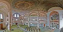 The large wooden barrel vault was decorated in 1619 by Nicolaus Storant of Meiningen with a ceiling painting, painted directly on the wood,[4] showing the heavenly throne of God as described in Revelation, chapters 4 and 5. Also from 1619 is a stone offertory box by Hans Markert.[4] On the northern long side and on the rear side are two seated galleries, one above the other, aligned with the pulpit with the four evangelists. The church interior, including the galleries, has a seating capacity of 1000.[16] The main entrance of the church on the south side from 1616 is splendidly decorated in Renaissance style. The east portal, also in Renaissance style with an obelisk, dates from 1615. On the south wall, Christian scenes in gray painting are arranged around the windows, showing God's love, faithfulness and care, Cain and Abel, David, and Goliath. On the walls are tombstones, which were rearranged between 1961 and 1975. A Baron von Stein is buried in the crypt under the choir.