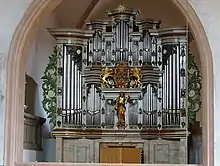 The organ in the choir room was built by Johann Ernst Döring in 1738 and stood in the extended west gallery from 1894 to 1975. When it was moved back to the choir loft in 1975, two side tower structures from 1894 were removed from the casing. The organ has two manuals and pedal with a total of 37 stops.[18] The case was repainted with the former color scheme and gilded. The organ was renovated by master organ builder Otto Hoffmann and Sons during the relocation. In the center is the ducal Saxon coat of arms with two gilded lions as coat of arms holders and above it the Zimbelstern. Below it is a trombone angel with movable arms, which was newly gilded during the renovation. The two large foliate vine surrounds were also newly carved.[4][19] A special feature is that when the Trompete 8' register in the Hauptwerk is operated, a mechanism is set in motion by which the angelic figure below the escutcheon puts the Trumpet to its mouth. The choir organ can also be played from the organ.[20]