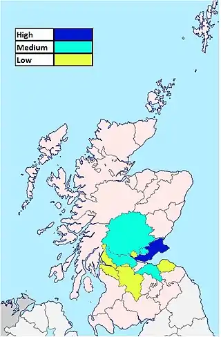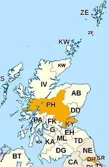 Oswald is most frequent in the KY postcode area (i.e. Fife and Kinross-shire) and the PH postcode area (namely in and around Perthshire) in Scotland. Also in the DH postcode area which covers central parts of County Durham in northern England. The town with the highest frequency is Burntisland in Fife. In 1881 the distribution was more concentrated and the area with the highest frequency was Fife and Kinross-shire (KY). In that year Fife and Kinross-shire contained 31% of all Oswalds in Scotland.[5]