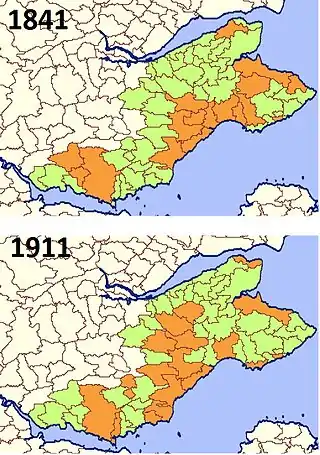 From the 1841 and 1911 census, by parish. Parishes with an occurrence shown in orange