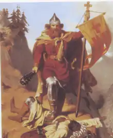 Otger Cataló (or 'Catalon' ) is a legendary character who with the Nine Barons of Fame would have conquered Catalonia from the Saracens sometime in the 8th century AD. According to some old theories, the name of Catalonia would have derived from its surname. In any case, the oldest written references to this character that have survived are from the fifteenth century, much later than any contemporaneous source. The legend was recovered mainly from XIX with the appearance of Renessaince and by the works of the authors of the Catalan Renaixença: Víctor Balaguer, Antoni Ferrer i Codina and Jacint Verdaguer.[1] The legend is based on events that occurred in three different generations. Otger agrees in the name and on the date of death with Otger (671-735), Arcomte de Catalanum (710-735), Duke of Aquitaine, who died in the battle for the reconquest of Roses and was buried in the Monastery of the island of Ré.[1]