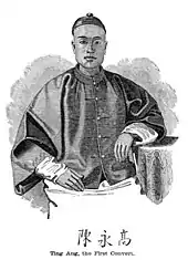 On June 14, 1857, Otis Gibson and Robert S. Maclay baptized their first convert, a native tradesman named Ting Ang (陈安).[5] Some weeks later he and Maclay made an unannounced visit to Ting Ang's house and found no sign of idols.[2]
